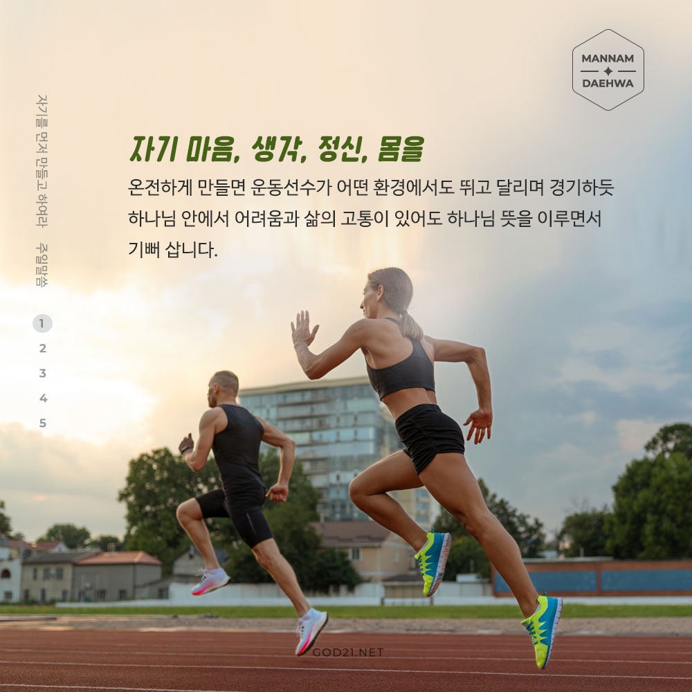 자기 마음, 생각, 정신, 몸을 온전하게 만들면 운동선수가 어떤 환경에서도 뛰고 달리며 경기하듯 하나님 안에서 어려움과 삶의 고통이 있어도 하나님 뜻을 이루면서 기뻐 삽니다.