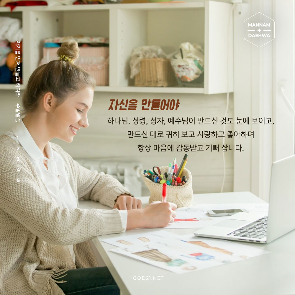 자신을 만들어야 하나님, 성령, 성자, 예수님이 만드신 것도 눈에 보이고, 만드신 대로 귀히 보고 사랑하고 좋아하며 항상 마음에 감동받고 기뻐 삽니다.