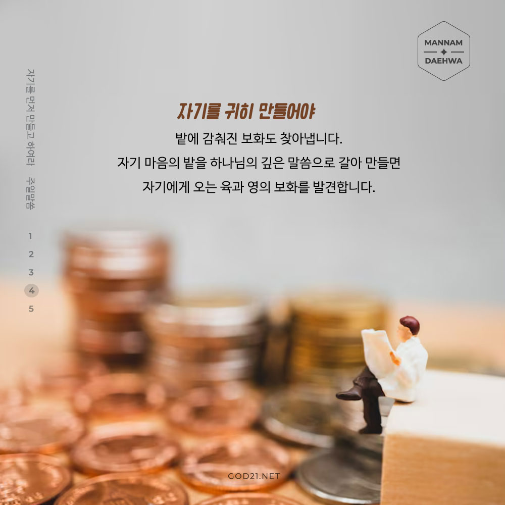 자기를 귀히 만들어야 밭에 감춰진 보화도 찾아냅니다.