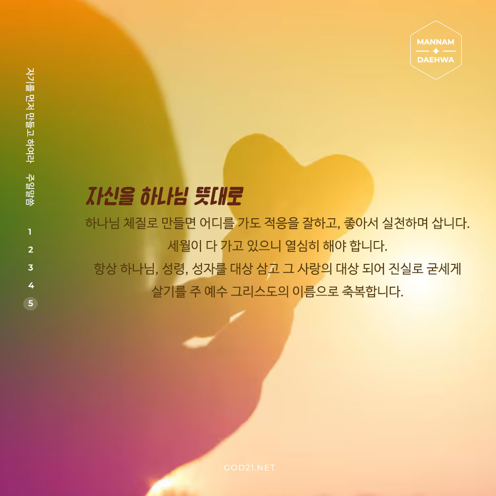 자신을 하나님 뜻대로 하나님 체질로 만들면 어디를 가도 적응을 잘하고, 좋아서 실천하며 삽니다.