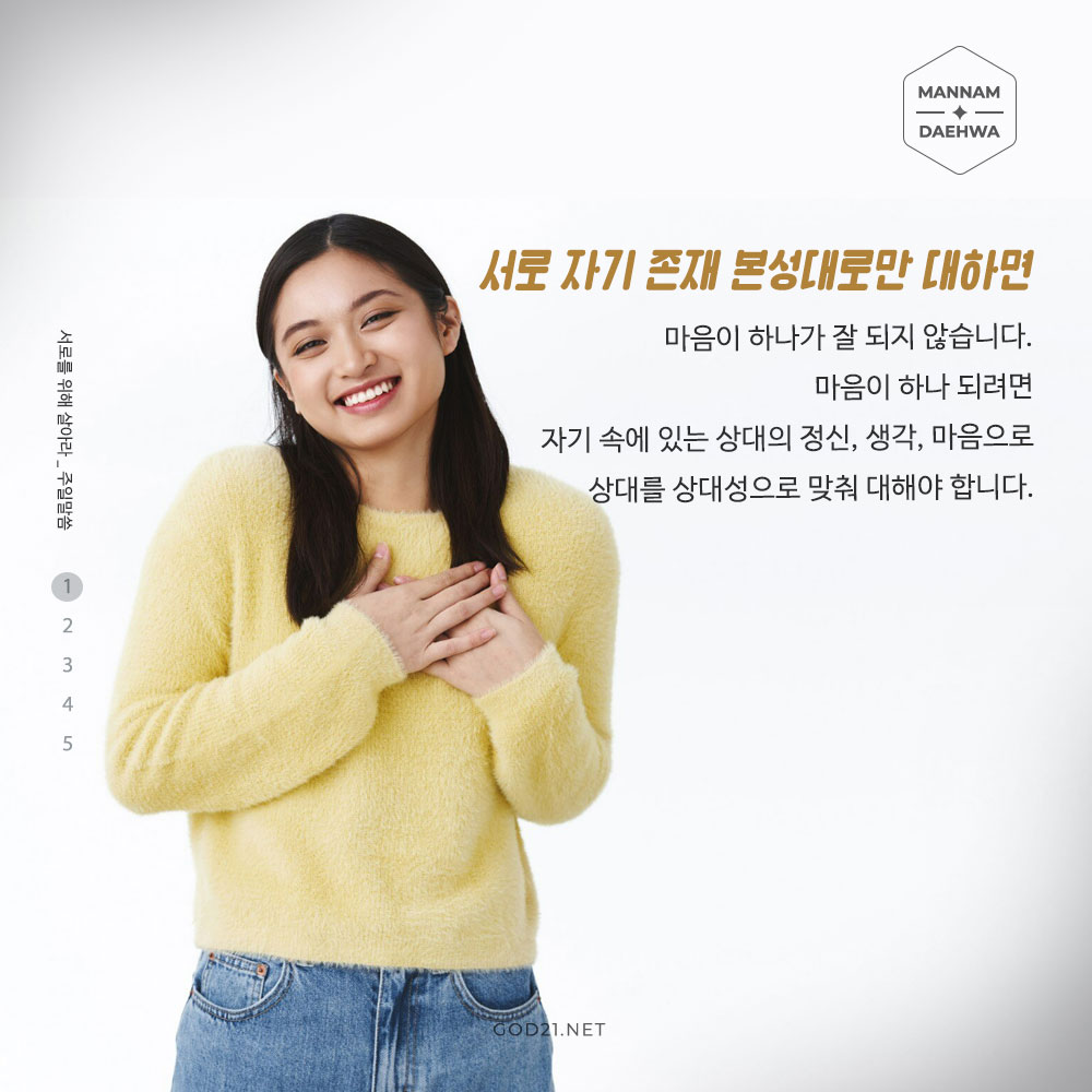 서로 자기 존재 본성대로만 대하면 마음이 하나가 잘 되지 않습니다.
