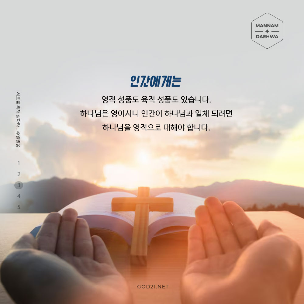하나님은 영이시니 인간이 하나님과 일체 되려면 하나님을 영적으로 대해야 합니다.