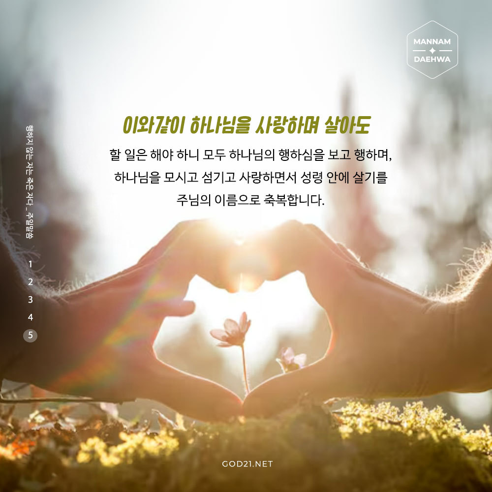 이와같이 하나님을 사랑하며 살아도 할 일은 해야 하니 모두 하나님의 행하심을 보고 행하며, 하나님을 모시고 섬기고 사랑하면서 성령 안에 살기를 주님의 이름으로 축복합니다.